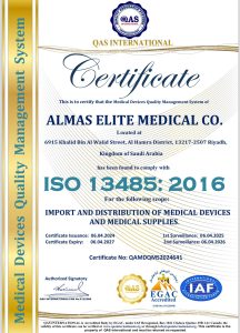 حصلت شركة نخبة ألماس الطبية على شهادة المنظمة الدولية للمعايير (ISO) لنظام إدارة جودة الأجهزة الطبية وبهذه المناسبة أعرب الدكتور فهد بن حمود القحطاني المدير العام لشركة نخبة ألماس الطبية بفخره واعتزازه بحصول الشركة على شهادة المنظمة الدولية للمعايير (ISO) لنظام إدارة جودة الأجهزة الطبية (ISO 13485:2016).