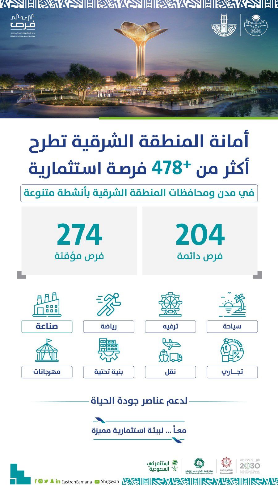 أمانة الشرقية تطرح أكثر من 478 فرصة استثمارية متنوعة لدعم التنمية الاقتصادية وجودة الحياة