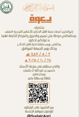 تنظم لجنة أعضاء نخبة أهل الحلال للأغنام النجدية بمحافظتي حوطة بني تميم والحريق، مهرجان الأغنام النجدية المميزة ،  اليوم الجمعة 21 اكتوبر 2025.