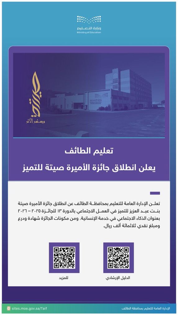 ودعت إدارة تعليم الطائف منسوبيها ومنسوباتها إلى الاطلاع على شروط وضوابط الجائزة والمشاركة بفعالية، بما يعزز دور التعليم في دعم المبادرات الوطنية والاجتماعية المتميزة .