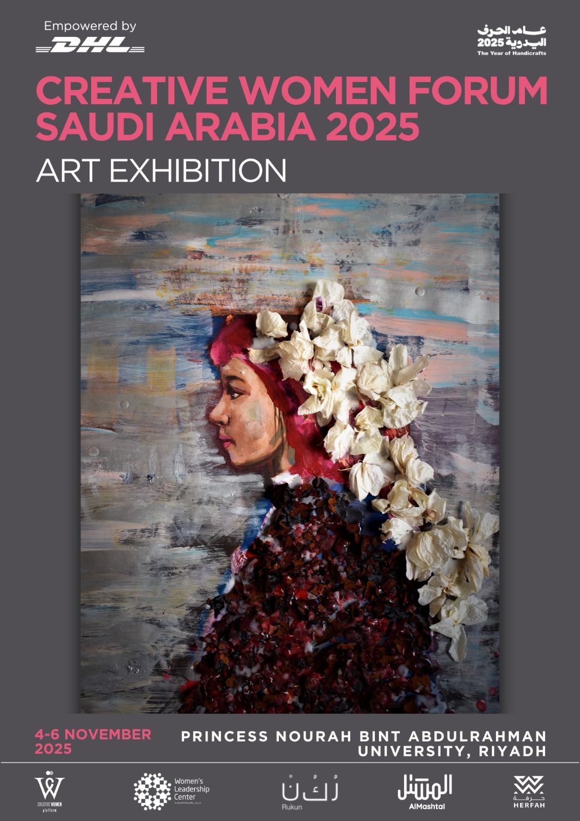 يجسد هذا المعرض المحاور الأساسية لمنتدى النساء المبدعات 2025، بما في ذلك تمكين المرأة والاستدامة والإبداع، من خلال الاحتفاء بتفوق النساء في الفنون، والمساهمة في تحقيق أثر اجتماعي هادف ومستدام، إلى جانب دعم الفنانات السعوديات المحليّات عبر جمعية حِرْفَة.