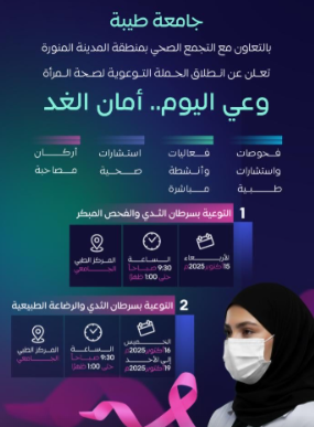 تُطلق جامعة طيبة بالتعاون مع تجمّع المدينة المنورة الصحي غدًا، الحملة التوعوية “وعيُ اليوم.. أمانُ الغد”؛ التي تهدف إلى تعزيز الوعي المجتمعي بأهمية الوقاية والكشف المبكّر عن الأمراض، ودعم المبادرات الوطنية الهادفة إلى تحسين جودة الحياة.