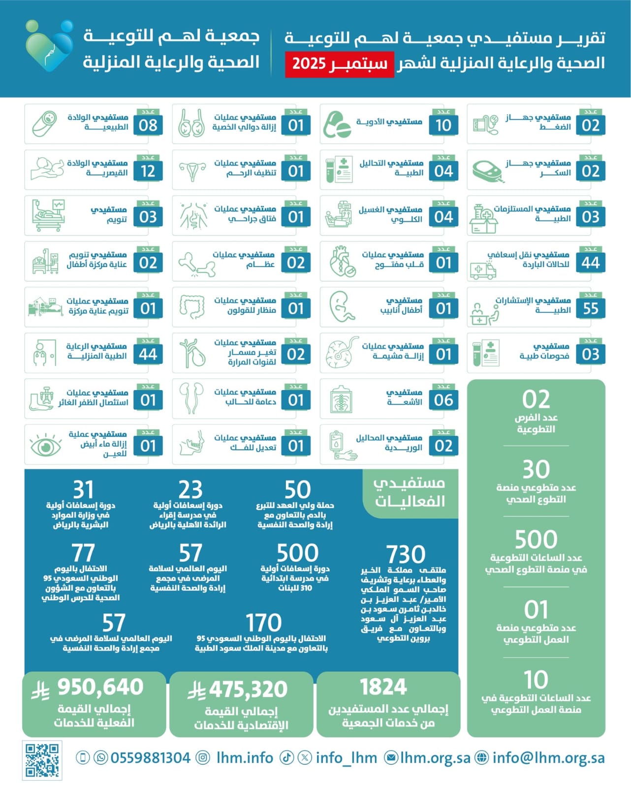أنهت جمعية “لهم” شهر سبتمبر بسلسلة من المبادرات الصحية والإنسانية التي جسّدت رسالتها في تعزيز الوعي الصحي وتقديم الرعاية المنزلية للفئات الأكثر احتياجًا، ضمن رؤية ترتكز على التمكين المجتمعي والاحتواء الإنساني.