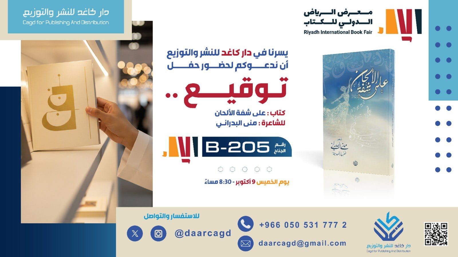 وجهت الشاعرة المتألقة خنساء المدينة أ. منى البدراني- دعوة حضور توقيع أول باكورة إنتاجها الشعري: (على شفة الألحان ) يوم الخميس المقبل 9 أكتوبر في تمام الساعة ٨.٣٠ م ، وتوجهت بالشكر لدار النشر كاغد للنشر والتوزيع على اهتمامهم وجهودهم
