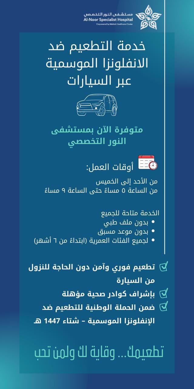 ضمن الحملة الوطنية للتطعيم ضد الإنفلونزا الموسمية لشتاء 1447هـ، أطلق مستشفى النور التخصصي خدمة التطعيم عبر السيارات، لتوفير تجربة ميسّرة وآمنة للمستفيدين.