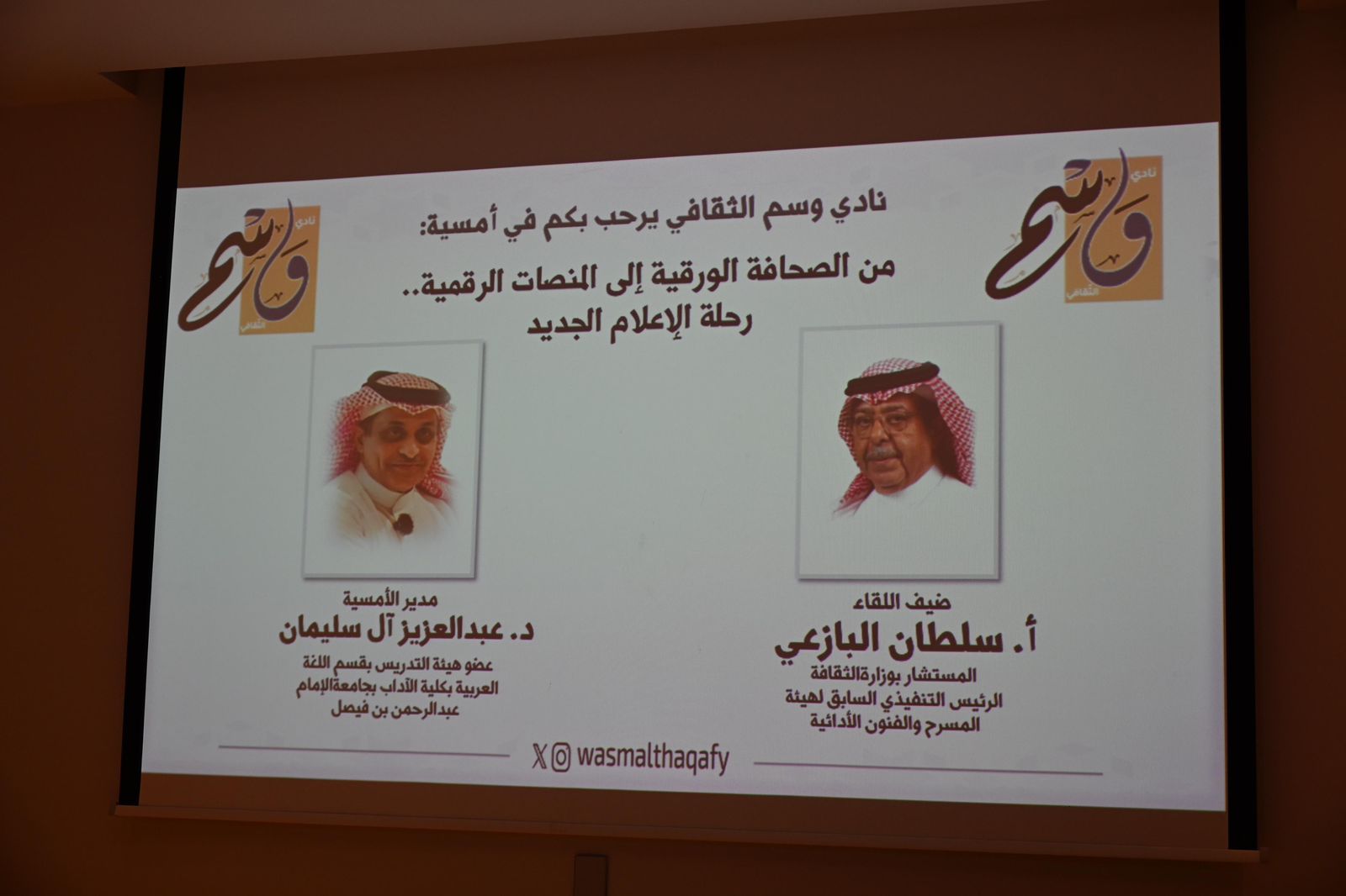 في مساءٍ تشابكت فيه الذاكرة مع الحاضر، فتح نادي وسم الثقافي أبوابه في غرفة الشرقية بالدمام ليضيء على رحلة الإعلام بين الورق والمنصات. ضيف الأمسية كان أ. سلطان البازعي، المستشار في وزارة الثقافة والرئيس الأسبق لهيئة المسرح والفنون الأدائية، في لقاء حمل عنوان: «من الصحافة الورقية إلى المنصات الرقمية.. رحلة الإعلام الجديد».