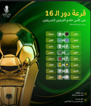 وستقام مباريات الدور السادس عشر لمسابقة كأس الملك السعودي لكرة القدم، يومي 27 و28 أكتوبر 2025.
