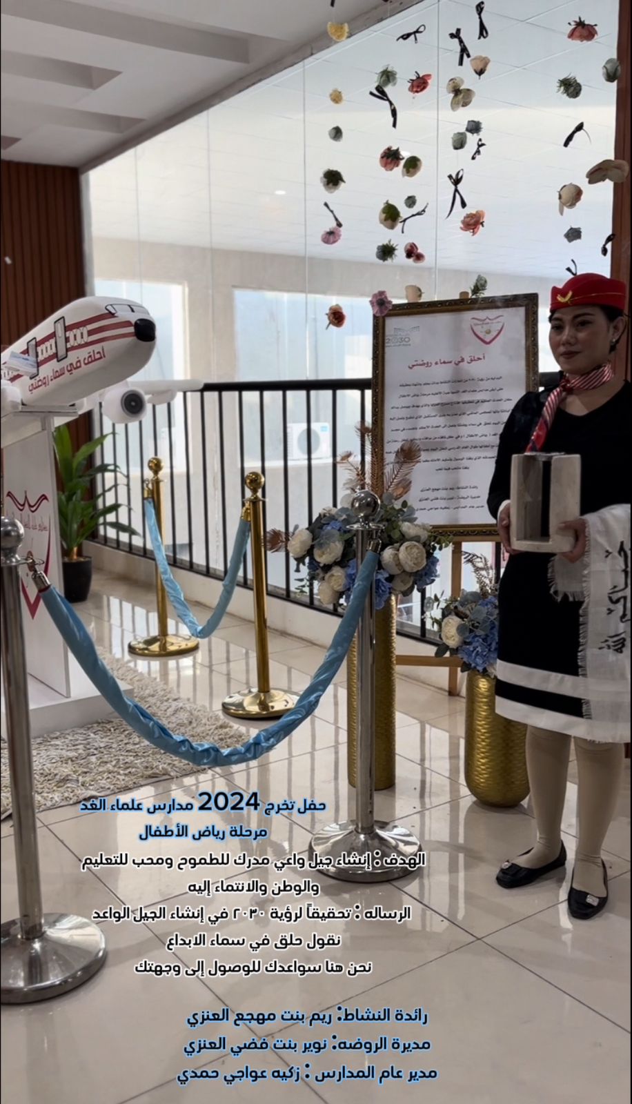حفل تخرج مرحلة رياض الأطفال من مدارس علماء الغد النموذجية الأهليه، الذي تكاتف فيه الجميع، في رحلة تحويل الحلم إلى حقيقه ، حلمنا وحققنا خطوه بخطوه يد بيد وحلقنا من الأرض إلى سماء روضة علماء الغد برؤية طموحه وهدف صائب سرنا على خطوات قادتنا وشغف همتنا وطموح أبنائنا في سماء العز والفخر والتميز تركنا بصمتنا ليتداولها جيل بعد جيل واليوم أكملناها وحققنا رحلتنا طوال هذا العام على شكل فيلم وثائقي بدأت رحلته من حكايا المستقبل إلى اليوم الوطني.