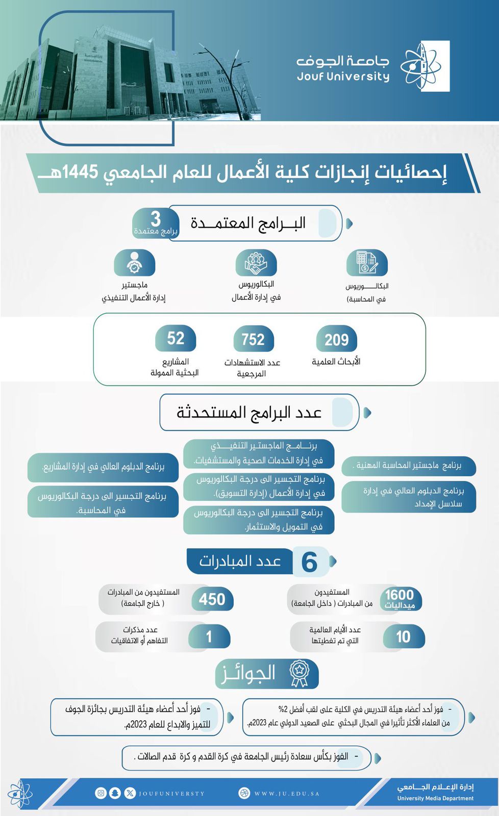 وبينت جامعة الجوف أن منجزات الكلية خلال العام الجامعي 1445 هـ تضمنت نشر 209 أبحاث علمية وإجراء 752 استشهاداً مرجعياً ، كما مولت الكلية 52 مشروعاً بحثياً .