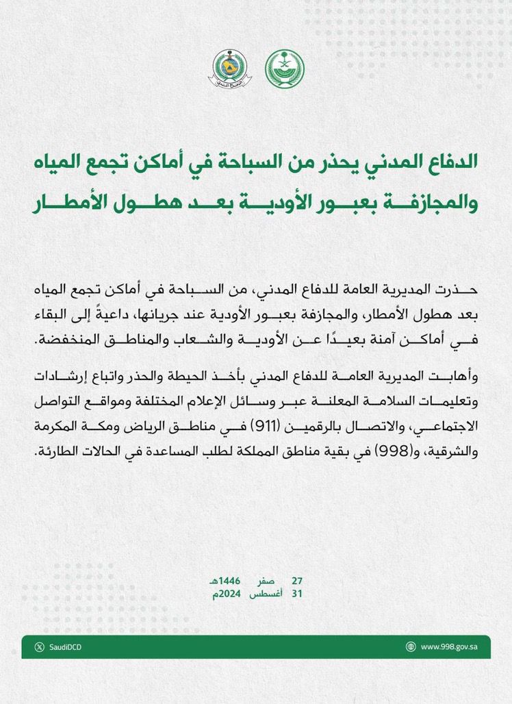 وأهابت المديرية العامة للدفاع المدني بأخذ الحيطة والحذر واتباع إرشادات وتعليمات السلامة المعلنة عبر وسائل الإعلام المختلفة ومواقع التواصل الاجتماعي، والاتصال بالرقمين (911) في مناطق الرياض ومكة المكرمة والشرقية، و(998) في بقية مناطق المملكة لطلب المساعدة في الحالات الطارئة.