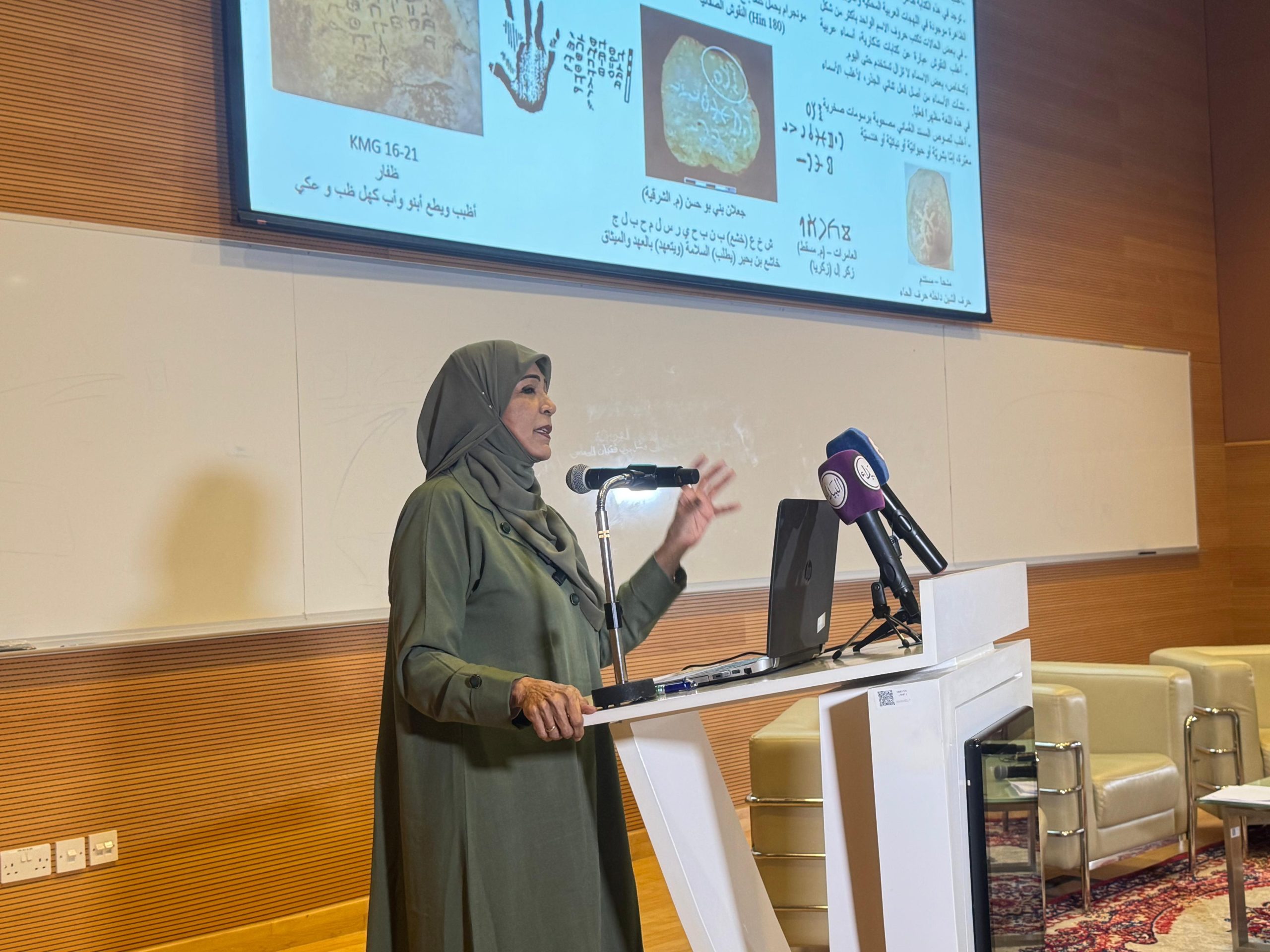 عرضت الدكتورة مجموعة من القطع الأثرية التي تحمل رموز مبكرة كتبت بخط المسند الطفاري يعود عمرها إلى الالف الثالث قبل الميلاد أي ان عمرها الان 4200 سنة حسب تحليل كربون ١٤ التي تعتبر الملهم الأول لها في فك شفرة هذا النظام الكتابي العريق وأن أصل لغة هذه الكتابة عربية وأوضحت انها تتبعت أصل الحرف العربي فوجدت أن لكل حرف قصة كما أوضحت الخصائص التي تميّز نقوش جنوب عُمان وقراءتها لنماذج منها أمام الحضور وأن نظام الكتابة العربي الجنوبي القديم العُماني واليمني وصل إلى الهند والصين وبلدان أوروبا عبر شواهد أثرية ونقوش تثبت حضوره العالمي، مشيرة إلى أن العالم ما يزال يستخدم الحروف العربية القديمة في العديد من اللغات والأنظمة الكتابية.