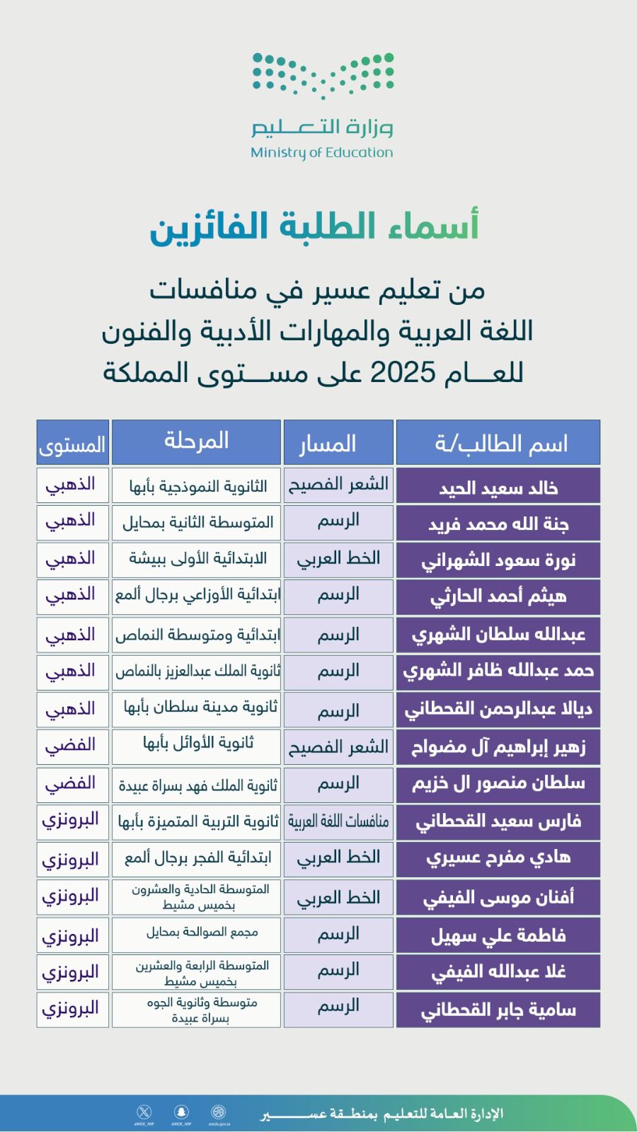 تألُّق 15 طالباً وطالبة بعسير في منافسات اللغة العربية على مستوى المملكة