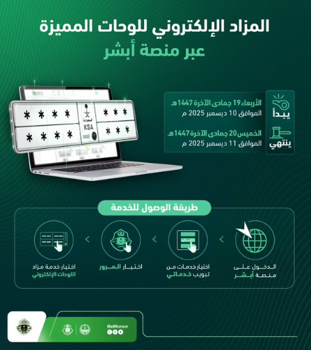 وأضافت الإدارة، عبر منصة (إكس)، ان ذلك يكون عبر منصة أبشر التي تمكّن الراغبين في شراء اللوحات المميزة من المشاركة في المزاد إلكترونيًا.