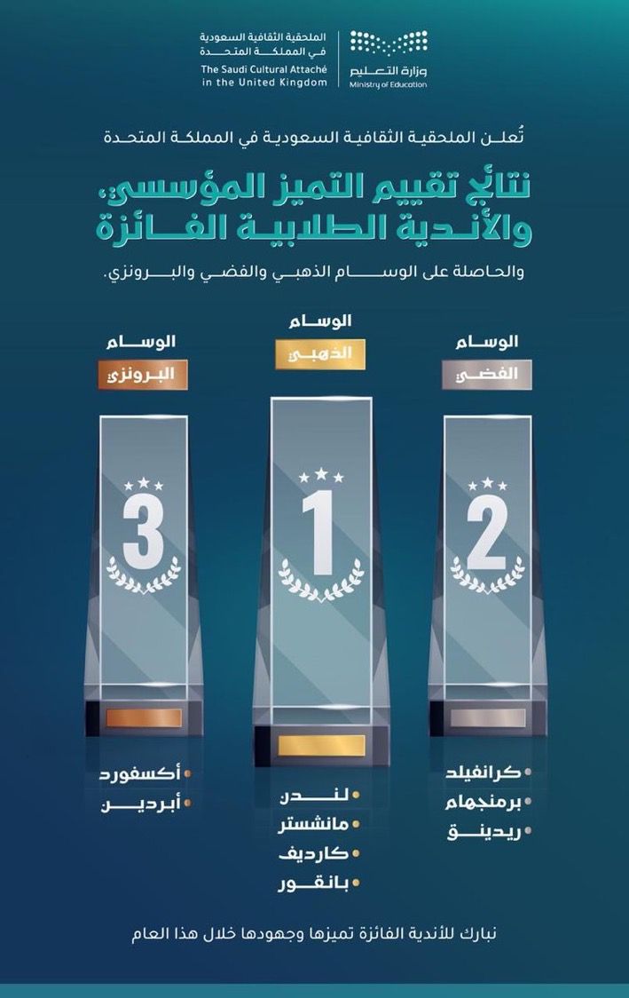 كما ثمّن النادي الدعم المستمر والتوجيه الدائم من الملحقية الثقافية السعودية في المملكة المتحدة والذي كان له الأثر الكبير في تمكين الأندية الطلابية وتحفيزها على تحقيق معايير التميز المؤسسي.