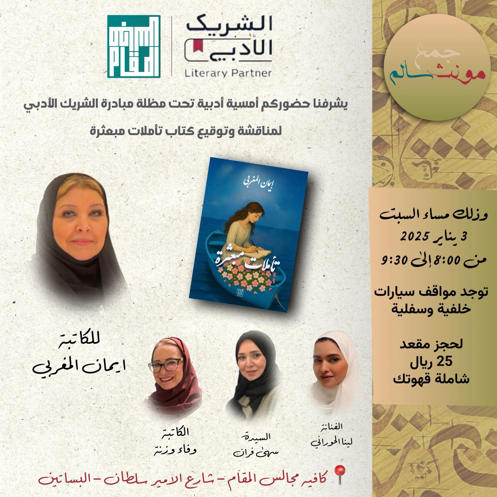تلتقي الكاتبة إيمان المغربي مع جمهورها ومحبي الأدب في أمسية أدبية مميزة تُقام تحت مظلة مبادرة الشريك الأدبي، وذلك لمناقشة وتوقيع كتابها «تأملات مبعثرة»، في لقاء ثقافي يفتح باب الحوار حول التجربة الإبداعية والنصوص التأملية التي يتضمنها الكتاب.