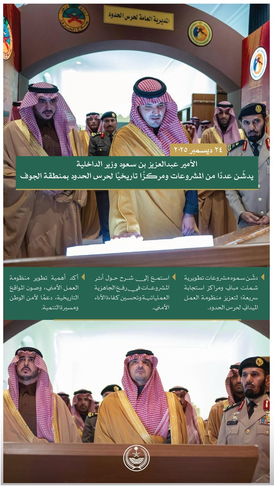الأمير عبدالعزيز بن سعود وزير الداخلية يدشّن عددًا من المشروعات ومركزًا تاريخيًا لحرس الحدود بمنطقة الجوف