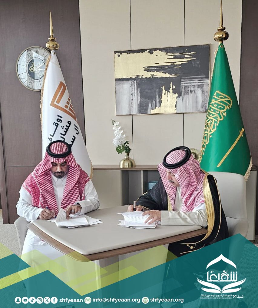 وقّعت جمعية شفيعاً لتعليم القرآن الكريم وعلومه لذوي الإعاقة، اتفاقية إطارية للتعاون مع أوقاف صاحب السمو الأمير مشاري بن مقرن بن محمد آل سعود، في خطوة تهدف إلى دعم تعليم القرآن الكريم لذوي الإعاقة وتعزيز الأثر المجتمعي المستدام.
