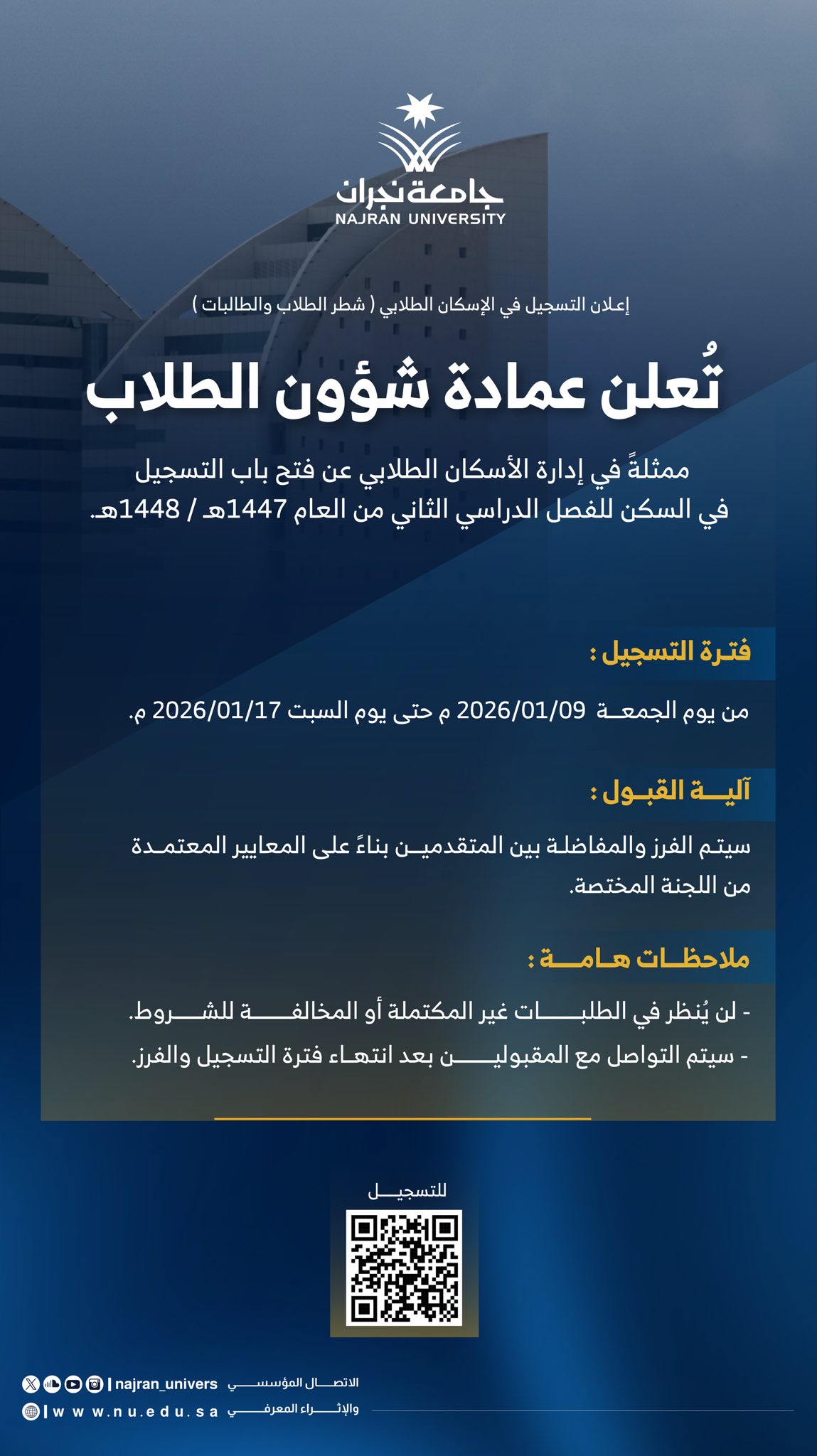 أعلنت عمادة شؤون الطلاب بجامعة نجران، ممثلةً بإدارة الإسكان الطلابي، عن فتح باب التقديم على السكن الجامعي للطلاب والطالبات للفصل الدراسي الثاني من العام الجامعي 1447–1448هـ، في إطار حرص الجامعة على توفير بيئة سكنية متكاملة تسهم في دعم الاستقرار الأكاديمي وتحسين جودة الحياة الجامعية للطلبة.