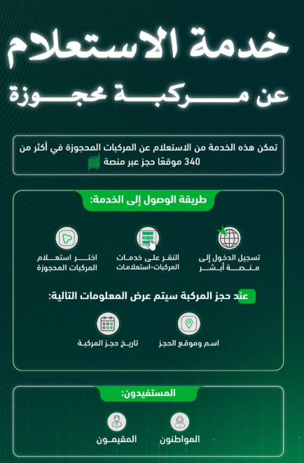 وتابعت، أنه عند حجز المركبة سيتم عرض معلومات تشمل «اسم وموقع الحجز، وتاريخ حجز المركبة»، ويستفيد من هذه الخدمة «المواطنون، والمقيمون».