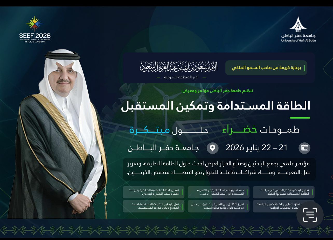 تحت رعاية كريمة من صاحب السمو الملكي الأمير سعود بن نايف بن عبدالعزيز آل سعود، أمير المنطقة الشرقية، تنظم جامعة حفر الباطن مؤتمر ومعرض الطاقة المستدامة وتمكين المستقبل SEEF2026
