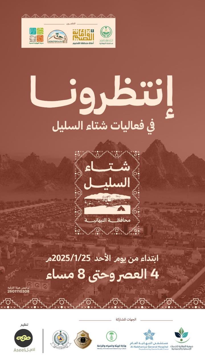 تستعد أمانة منطقة القصيم ممثلة ببلدية محافظة النبهانية لإطلاق مهرجان شتاء السليل في منتزه السليل بمحافظة النبهانية ابتداءً من يوم الأحد 25 / 1 / 2026م ويستمر لمدة خمسة أيام وسط أجواء شتوية مميزة وبرامج متنوعة تناسب جميع أفراد الأسرة