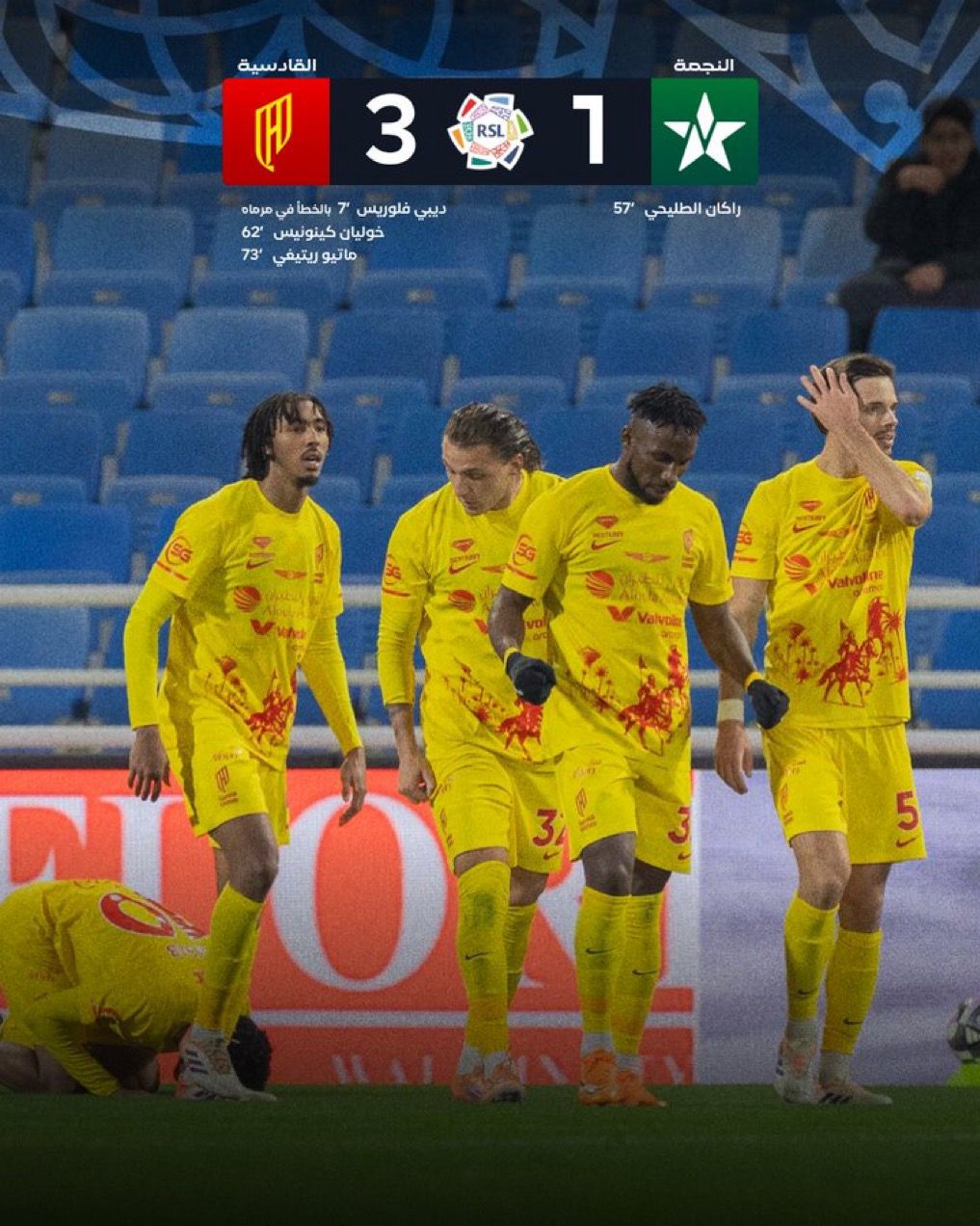 أحرز أهداف القادسية الهندوراسي ديبي فلوريس (7 بالخطأ في مرماه) والمكسيكي جوليان كينيونيس (62) والإيطالي ماتيو ريتيغي (74) بينما سجل للنجمة، راكان الطليحي (57) .