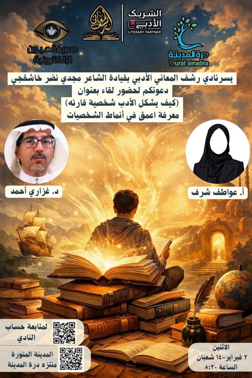 ضمن البرامج الأدبية و الثقافية التي ينظمها، و المقدمة إلى شريحة واسعة من الجمهور؛ نادي رشف المعاني الأدبي بقياده الشاعر مجدي خاشقجي، يقيم لقاء بعنوان “كيف يشكل الأدب شخصيه قارئه” ، وذلك يوم الاثنين 2 فبراير 2026 ، بدءا من الساعة الثامنة والنصف مساء.
