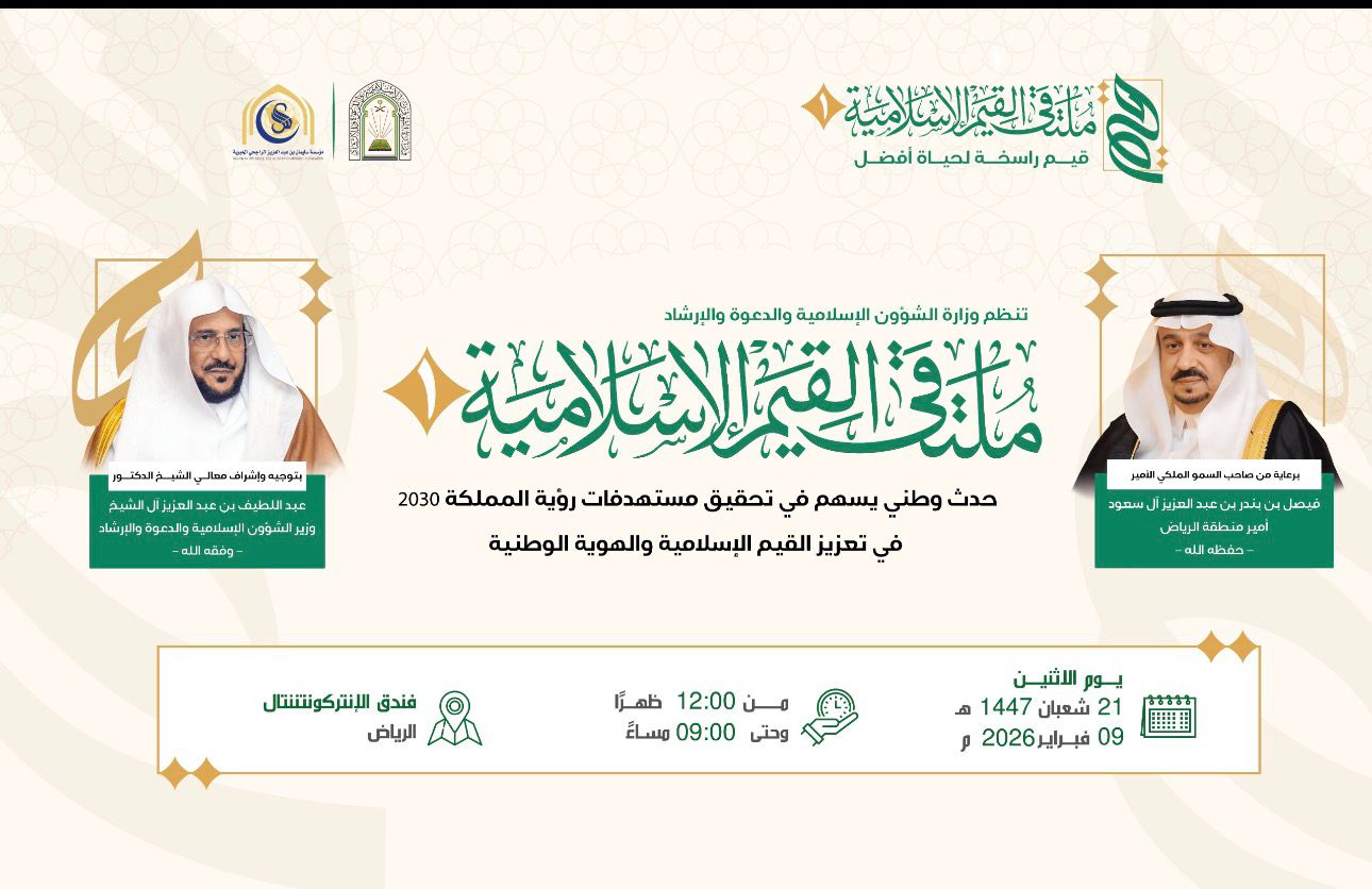 تحت رعاية صاحب السمو الملكي الأمير فيصل بن بندر بن عبدالعزيز، أمير منطقة الرياض، وبتوجيه وإشراف من معالي وزير الشؤون الإسلامية والدعوة والإرشاد الشيخ الدكتور عبداللطيف بن عبدالعزيز آل الشيخ، تنظم وزارة الشؤون الإسلامية والدعوة والإرشاد؛ ملتقى القيم الإسلامية الأول تحت شعار “قيم راسخة لحياة أفضل”، وذلك يوم الاثنين الحادي والعشرين من شهر شعبان 1447هـ، الموافق التاسع من شهر فبراير 2026م، في فندق الإنتركونتننتال بمدينة الرياض، الذي يشارك فيه عدد من أصحاب المعالي الوزراء، وأصحاب السعادة والفضيلة، إلى جانب نخبة من المختصين والمهتمين لمناقشة سبل تعزيز القيم الإسلامية.