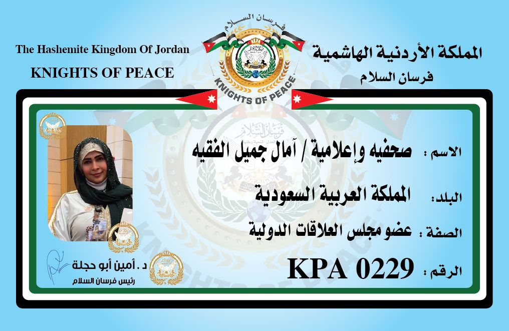حصلت الإعلامية آمال جميل الفقيه عضو مجموعة الغد الإعلامية على بطاقة عضوية في مجلس العلاقات الدولية لفرسان السلام برئاسة الدكتور أمين أبو حجلة