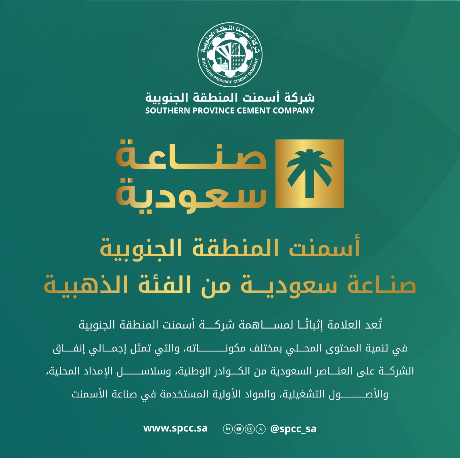 أسمنت المنطقة الجنوبية تحصل على العلامة الذهبية لـ صناعة سعودية وتعزز المحتوى المحلي