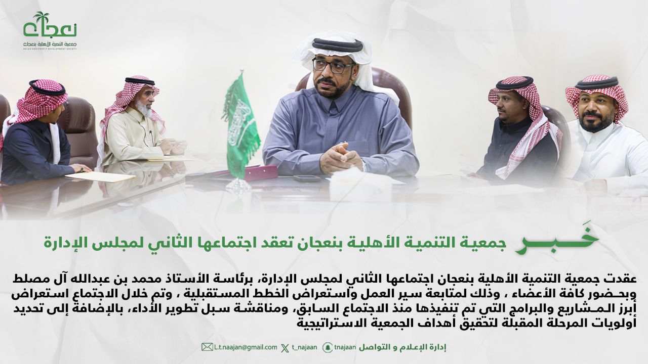 عقدت جمعية التنمية الأهلية بنعجان اجتماعها الثاني لمجلس الإدارة، برئاسة الأستاذ محمد بن عبدالله آل مصلط، وبحضور كافة الأعضاء، وذلك لمتابعة سير العمل واستعراض الخطط المستقبلية.