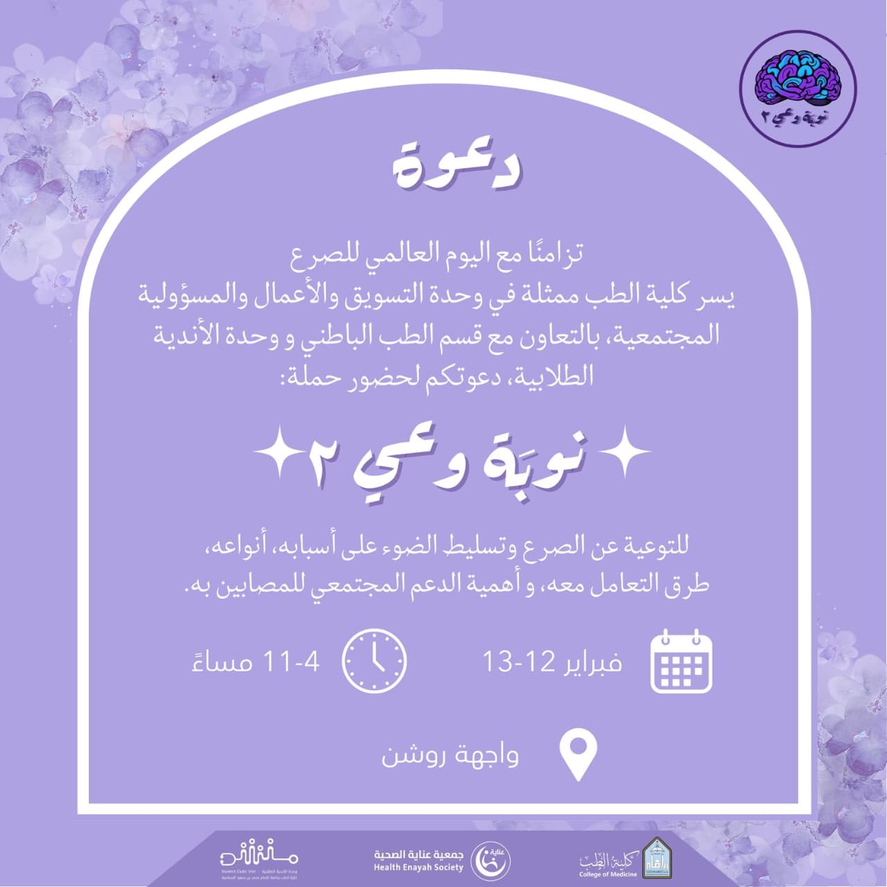 تزامنًا مع اليوم العالمي للصرع، يسر كلية الطب – ممثلة في وحدة التسويق والأعمال والمسؤولية المجتمعية – وبالتعاون مع قسم الطب الباطني ووحدة الأندية الطلابية، دعوتكم لحضور حملة “نوبة وعي 2″، والتي تهدف إلى رفع مستوى الوعي المجتمعي حول مرض الصرع.