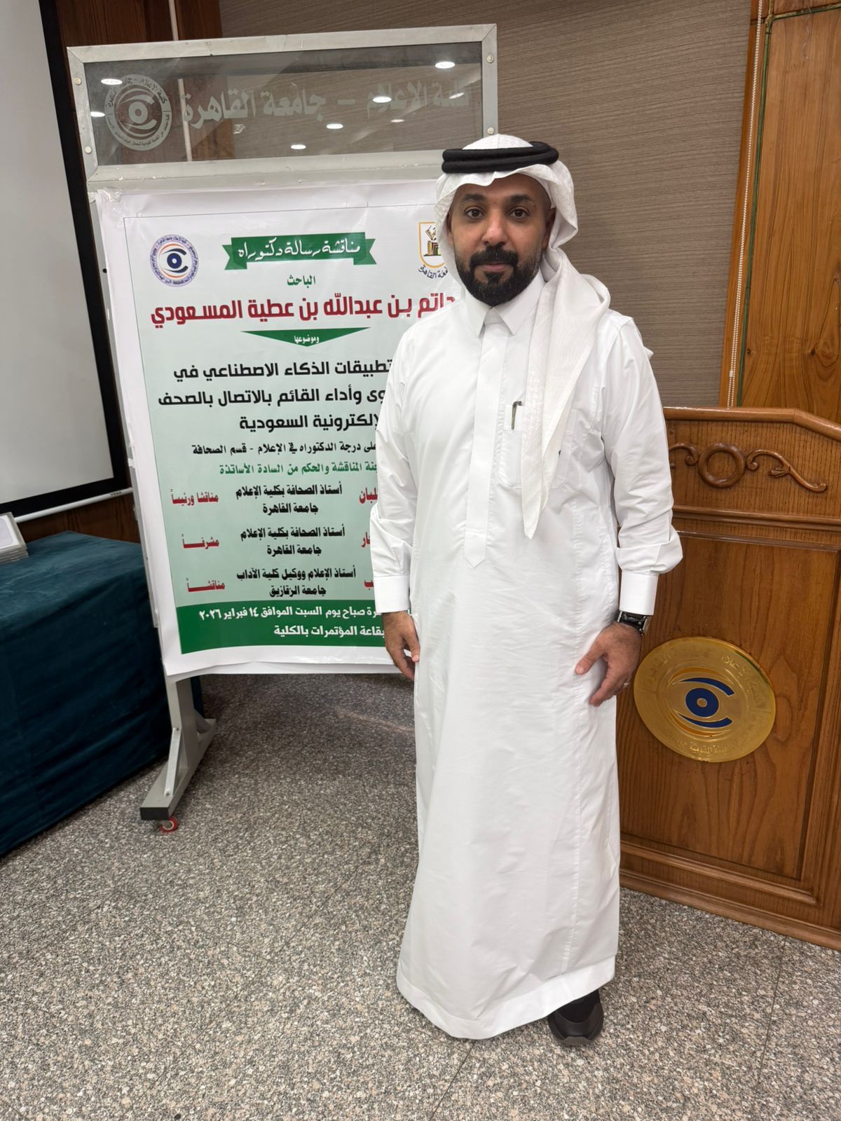 «تأثيرات تطبيقات الذكاء الاصطناعي في إنتاج المحتوى وأداء القائم بالاتصال بالصحف الإلكترونية السعودية»، ومنحته لجنة المناقشة والحكم الدرجة مع مرتبة الشرف الأولى.