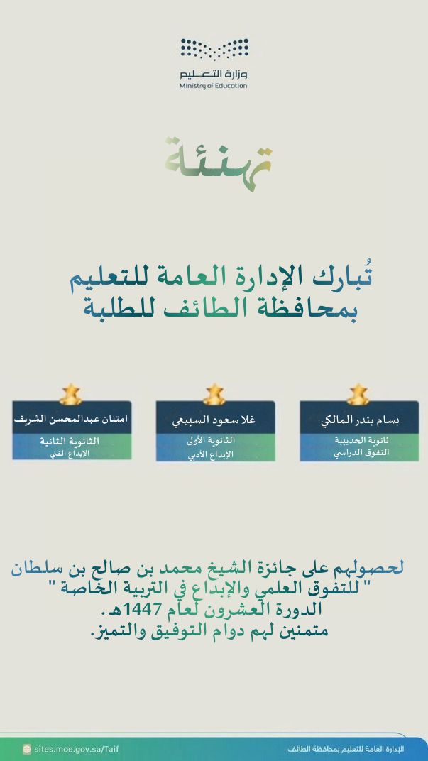 طلبة تعليم الطائف يحققون ثلاث جوائز في جائزة الشيخ محمد بن صالح بن سلطان للتفوق والإبداع