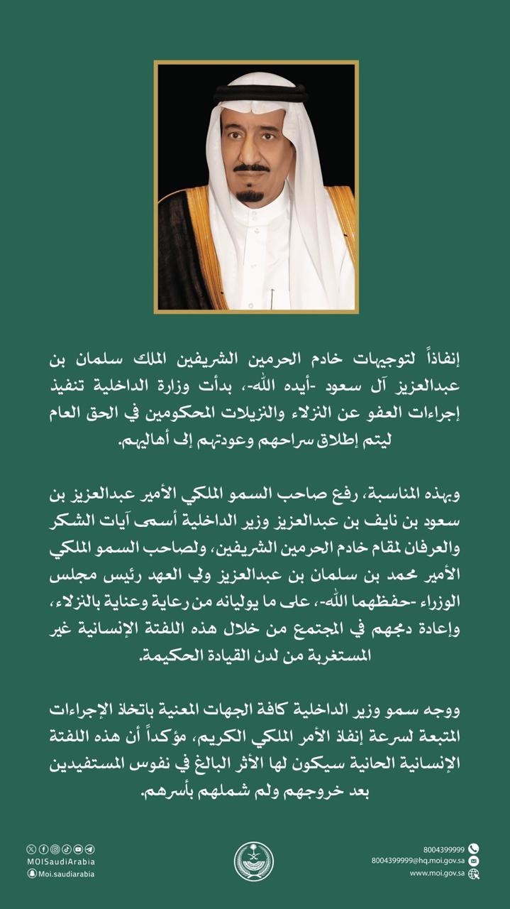 في امتدادٍ لنهج القيادة الرشيدة القائم على الرحمة وتعزيز قيم الإصلاح، بدأت وزارة الداخلية تنفيذ إجراءات العفو عن النزلاء والنزيلات المحكومين في الحق العام، وذلك إنفاذًا لتوجيهات خادم الحرمين الشريفين الملك سلمان بن عبدالعزيز آل سعود – أيده الله – بإطلاق سراح المستفيدين وعودتهم إلى أسرهم.