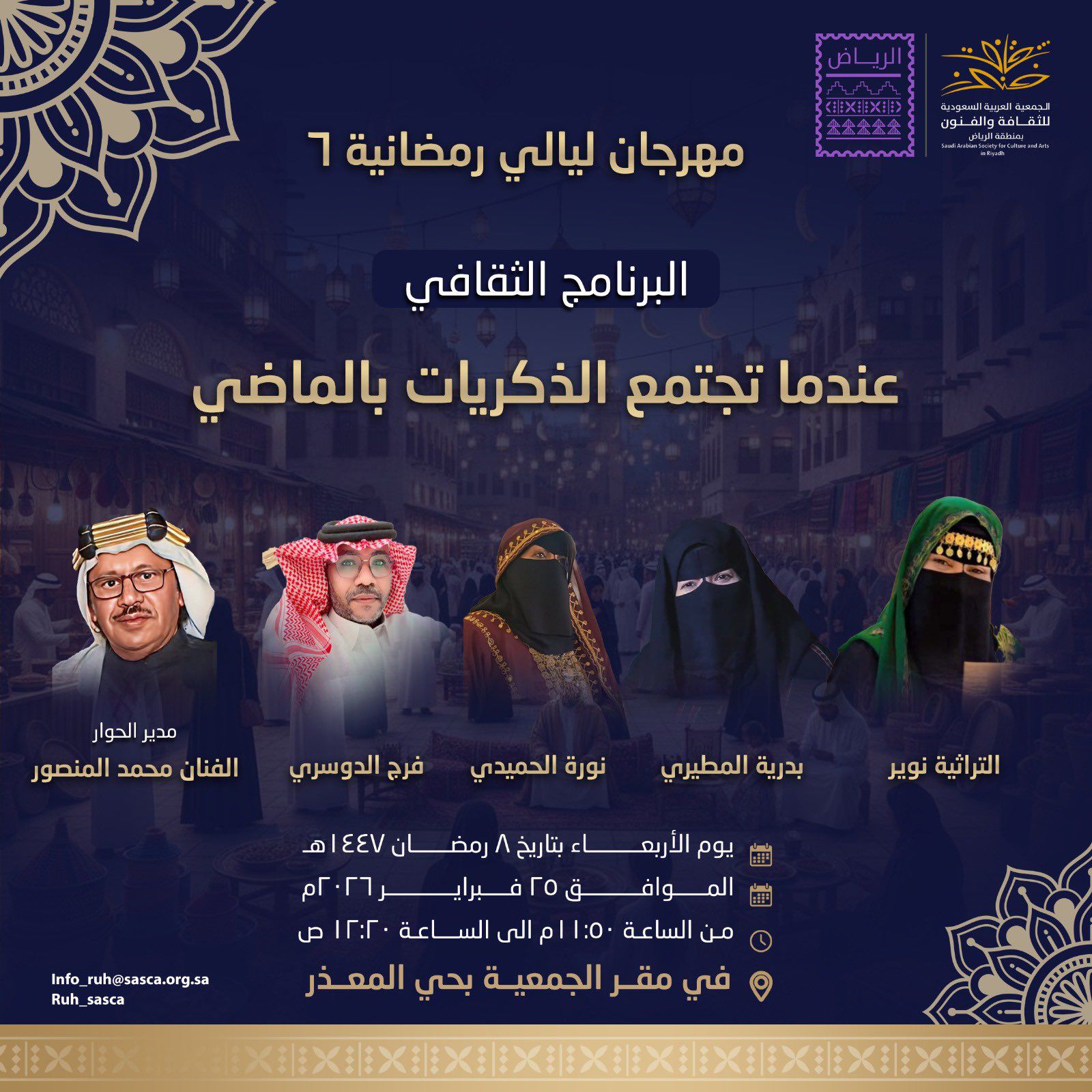 تحت رعاية #جمعية_الثقافة_والفنون_بالرياض، تنطلق فعاليات #ليالي_رمضانية٦ في أمسية ثقافية استثنائية، تُدشّن برنامجها بحوارٍ ملهم يحمل عنوان: “بين البدايات والنجومية.. نحكي الحكاية”، وذلك مساء الأربعاء ٨ رمضان ١٤٤٧هـ الموافق ٢٥ فبراير ٢٠٢٦م، في مقر الجمعية بحي المعذر، ابتداءً من الساعة ٩:٣٠ مساءً وحتى ١ فجراً، ولمدة أربعة أيام.