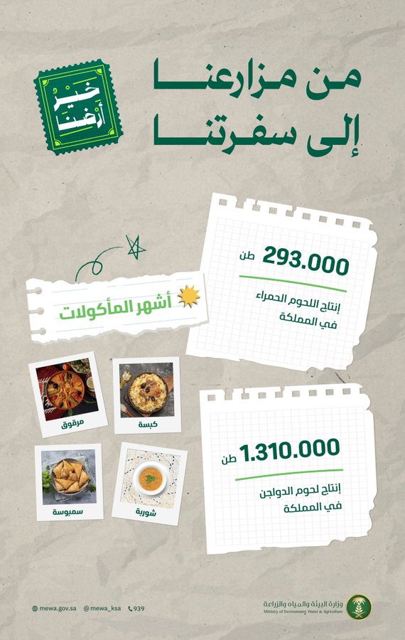 وأوضحت الوزارة ضمن حملة “خير أرضنا”، التي أطلقتها لتسليط الضوء على دعم المنتجات المحلية، والتحفيز على استهلاكها خلال الشهر الفضيل، أن إنتاج اللحوم الحمراء في المملكة بلغ نحو (293) ألف طن، لتسهم في تسيّد الموائد الرمضانية بتنوعها الذاخر، وجودتها المتميزة.