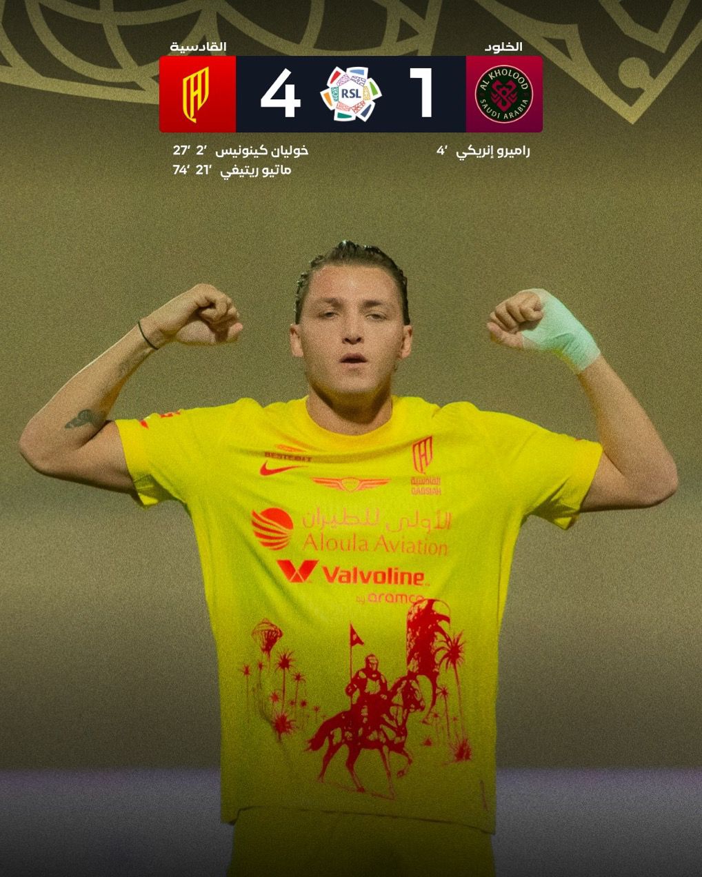 لفريقه بتسجيل الهدف الثاني في الدقيقة 21، قبل أن يضيف كينونيس الهدف الثالث في الدقيقة 24 لينتهي الشوط الأول بتفوق القادسية 3-1.