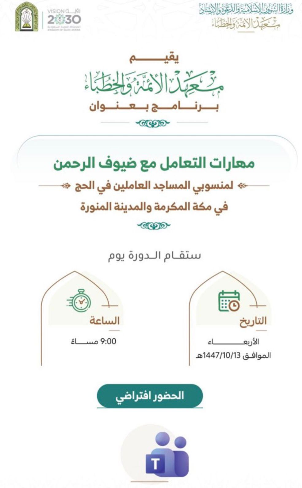 ضمن الجهود الاستثنائية والمبكرة التي تبذلها وزارة الشؤون الإسلامية والدعوة والإرشاد للاستعداد لموسم الحج، وبتوجيهات معالي وزير الشؤون الإسلامية والدعوة والإرشاد الشيخ الدكتور عبداللطيف بن عبدالعزيز آل الشيخ – حفظه الله – نظمت الوزارة ممثلةً بمعهد الأئمة والخطباء برنامجًا تدريبيًا بعنوان “مهارات التعامل مع ضيوف الرحمن”، استهدف منسوبي المساجد المشاركين في خدمة ضيوف الرحمن في فرعي الوزارة بمنطقتي مكة المكرمة والمدينة المنورة، وذلك عبر الاتصال المرئي، بمشاركة قرابة (4700) مشارك.