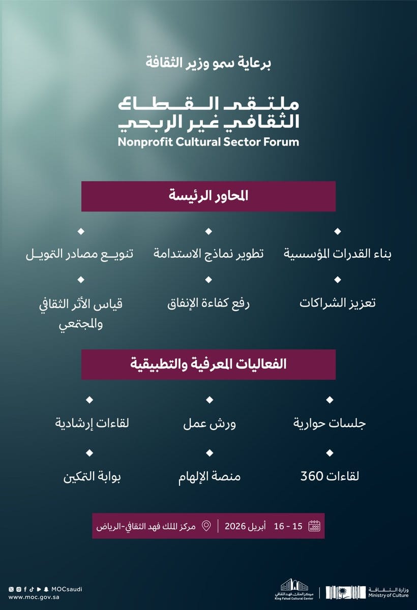 تنظّم وزارة الثقافة السعودية ملتقى القطاع الثقافي غير الربحي، خلال الفترة من 15 إلى 16 أبريل 2026م، و ذلك في مركز الملك فهد الثقافي بمدينة الرياض، في نسخته الأولى، بوصفه منصةً وطنية تجمع قيادات القطاع الثقافي وصنّاع القرار والخبراء و المهتمين.