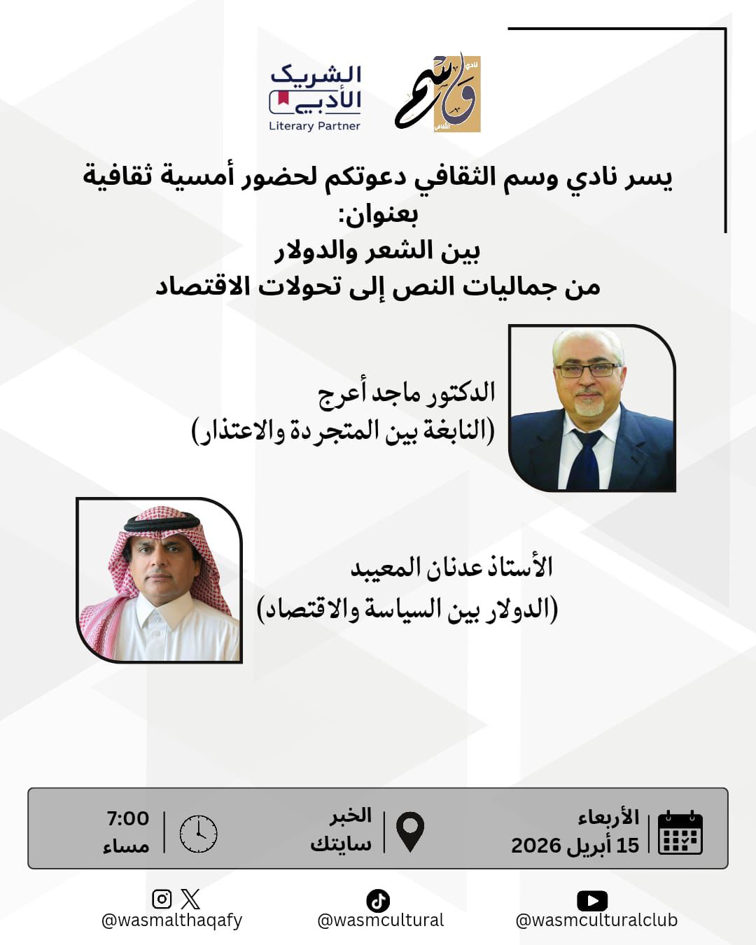 في مساءٍ يميل إلى التأمل؛ يفتح نادي وسم الثقافي أبوابه لأمسية تحمل عنوان “بين الشعر والدولار”، وذلك يوم الأربعاء 15 أبريل 2026، في مبنى سايتك في الخبر.