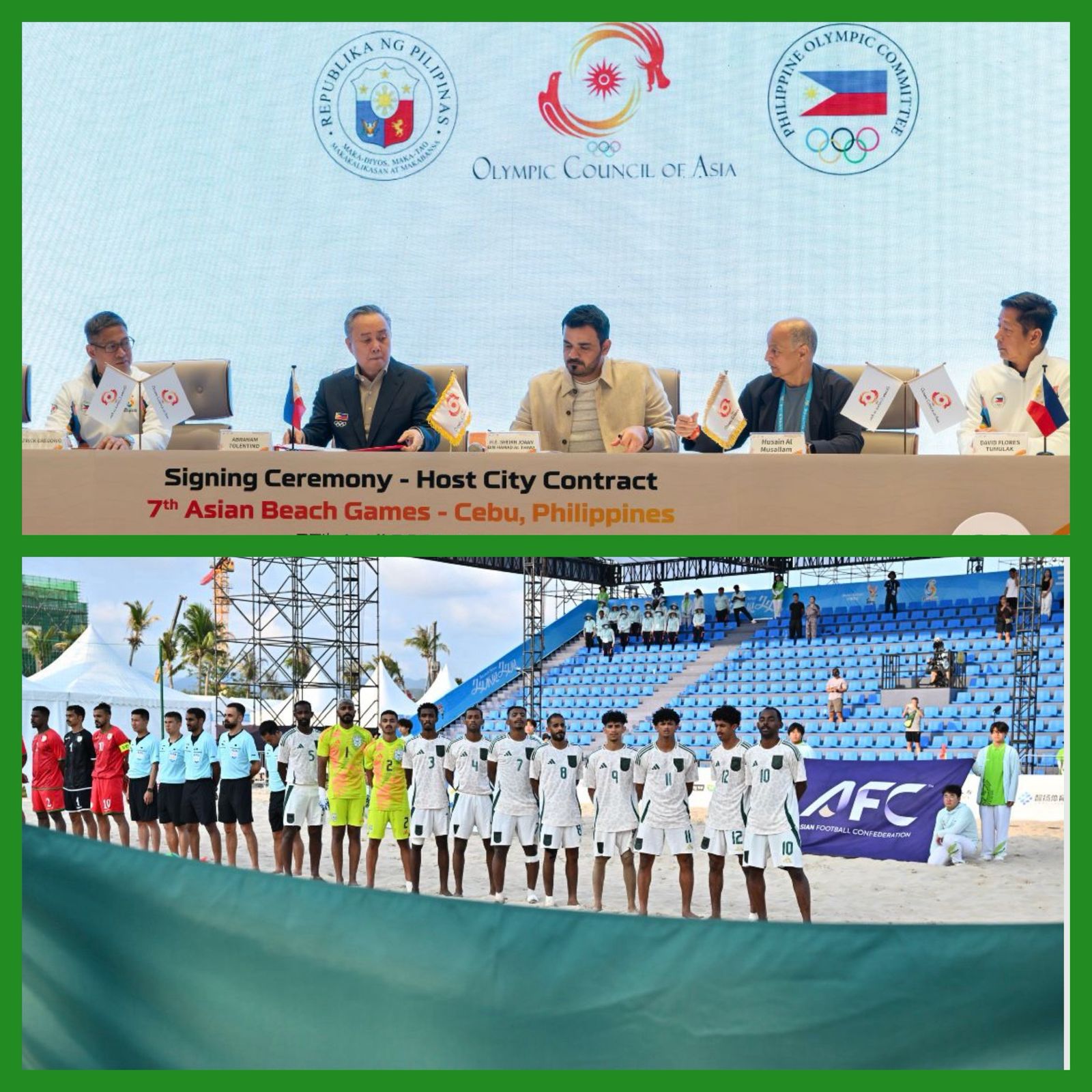 ومن جانب آخر، وعلى هامش الدورة، وقّع سعادة الشيخ جوعان بن حمد آل ثاني، رئيس المجلس الأولمبي الآسيوي، إلى جانب سعادة السيد أبراهام تولينتينو، رئيس اللجنة الأولمبية الفلبينية، رسميًا اتفاقية استضافة النسخة السابعة من دورة الألعاب الآسيوية الشاطئية «سيبو 2028»، وذلك بمدينة سانيا الصينية، بحضور عدد من مسؤولي المجلس الأولمبي الآسيوي والجانب الفلبيني، تأكيدًا لاستمرار مسيرة الألعاب الآسيوية الشاطئية وتعزيز حضورها في القارة الآسيوية.