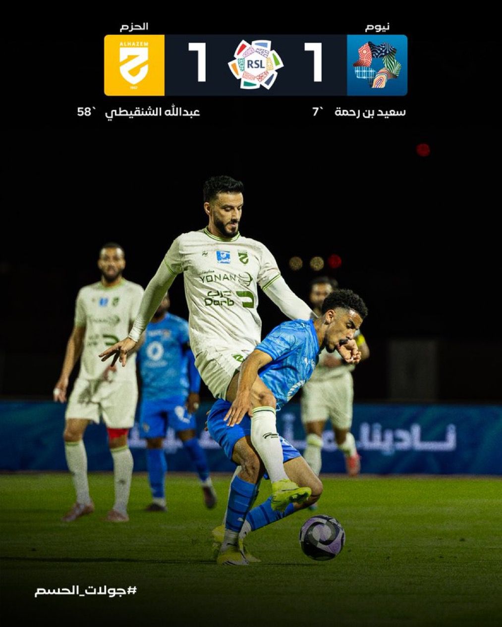 ضمن فعاليات الجولة 30 من دوري روشن السعودي تعادل نياديا نيوم و الحزم بنتيجة 1 – 1 في اللقاء الذي جمع بينهما.