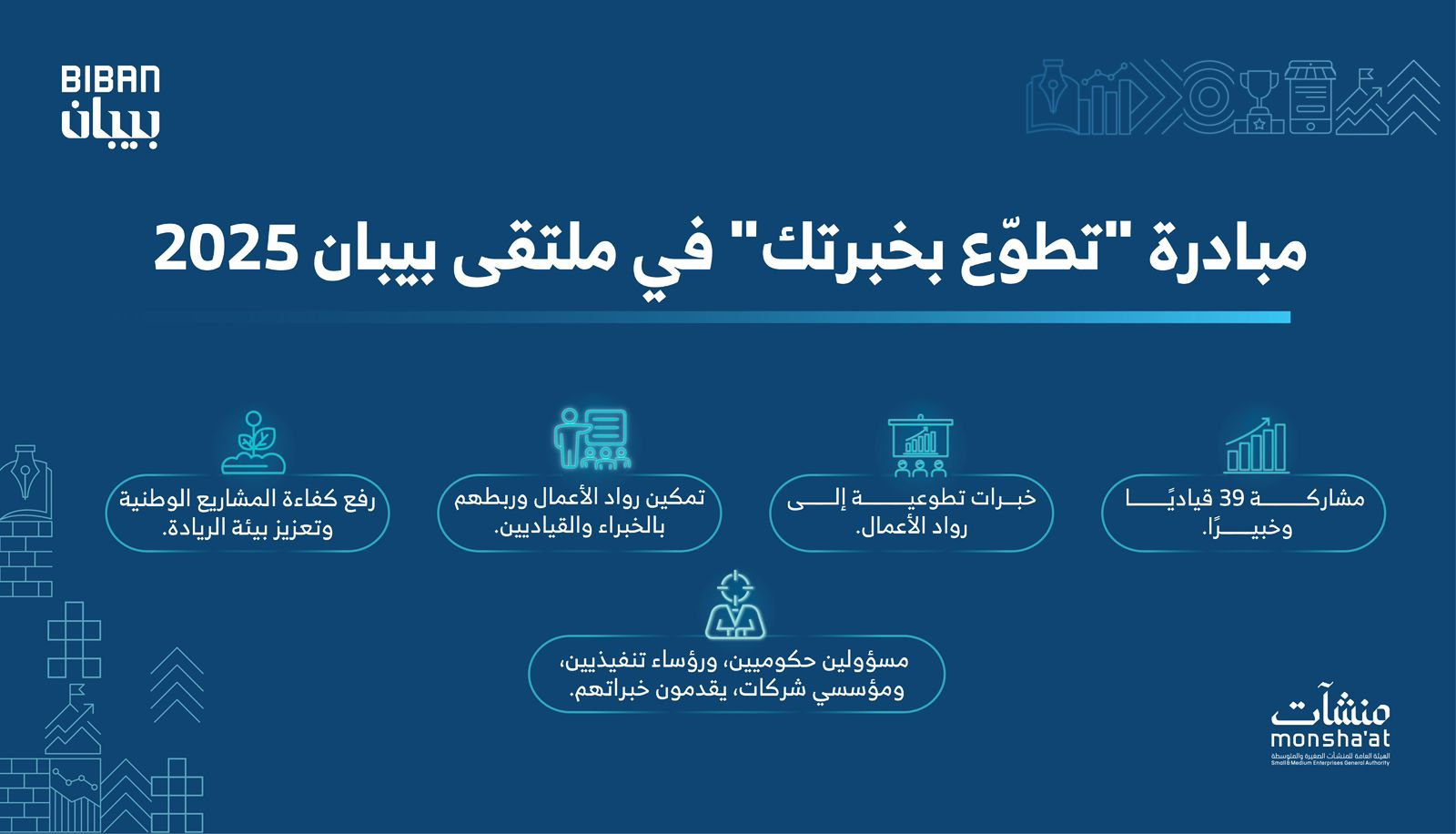 يشارك أكثر من (39) قياديًا وخبيرًا ضمن مبادة “تطوع بخبرتك” في ملتقى “بيبان 2025” الذي تنظمه الهيئة العامة للمنشآت الصغيرة والمتوسطة “منشآت” خلال الفترة من 5 حتى 8 نوفمبر المقبل في مركز واجهة الرياض للمعارض والمؤتمرات، تحت شعار “وجهة عالمية للفرص”، وذلك بهدف الاستفادة من الخبرات القيادية في القطاع الريادي والاستثماري لدعم رواد الأعمال وتقديم الاستشارة المناسبة لهم في مشاريعهم.